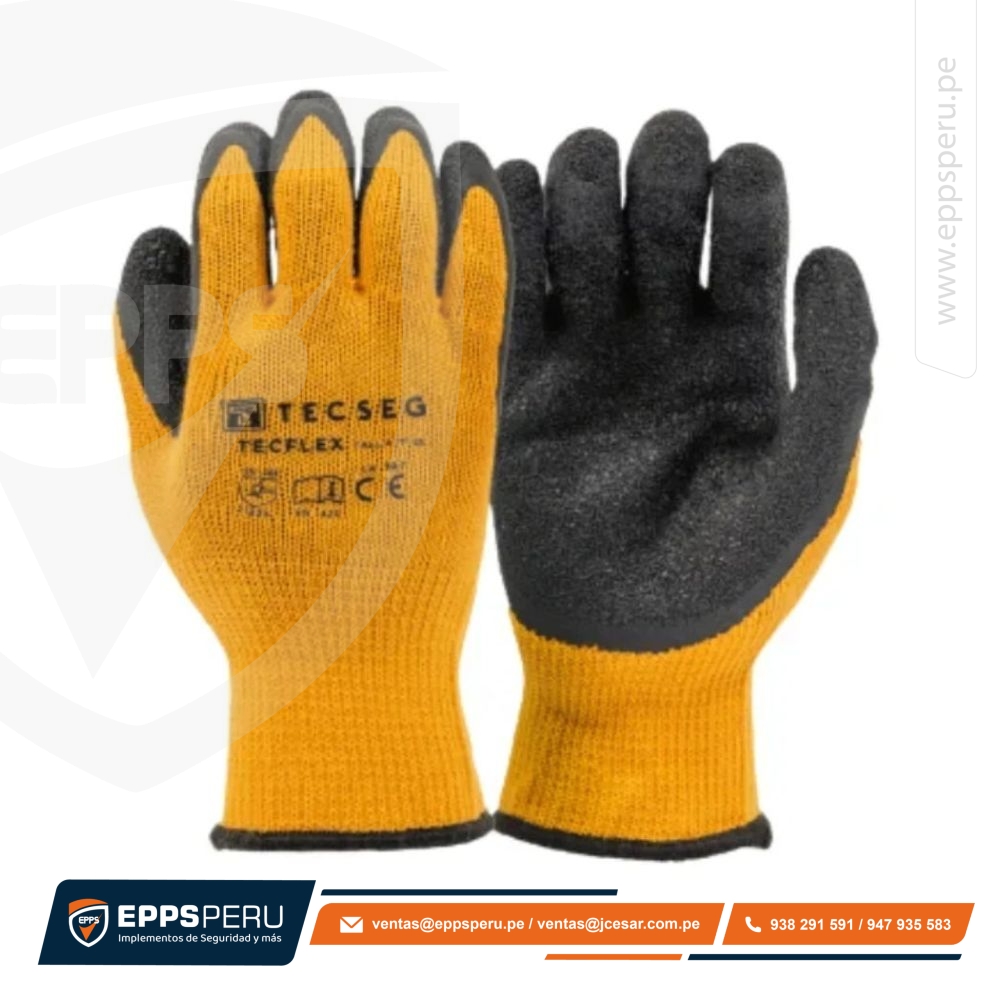 Guante TecFlex elaborado con tejido amarillo de poli algodón y recubrimiento de látex corrugado en la palma, proporcionándole alta resistencia al desgarro, excelente agarre y destreza en el trabajo.