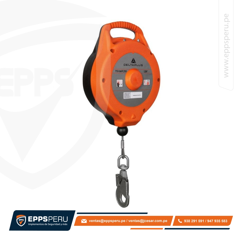 Anticaídas retráctil automático, compuesto por 2 semicárteres de material composite (ABS) de alta resistencia, que mejora la resistencia a la corrosión y a los choques, cable galvanizado de ø 4 mm de 15 m de longitud con conector de tornillo AM016, Materiales Semicárteres : material composite (ABS), funcionan también sobre plano inclinado.