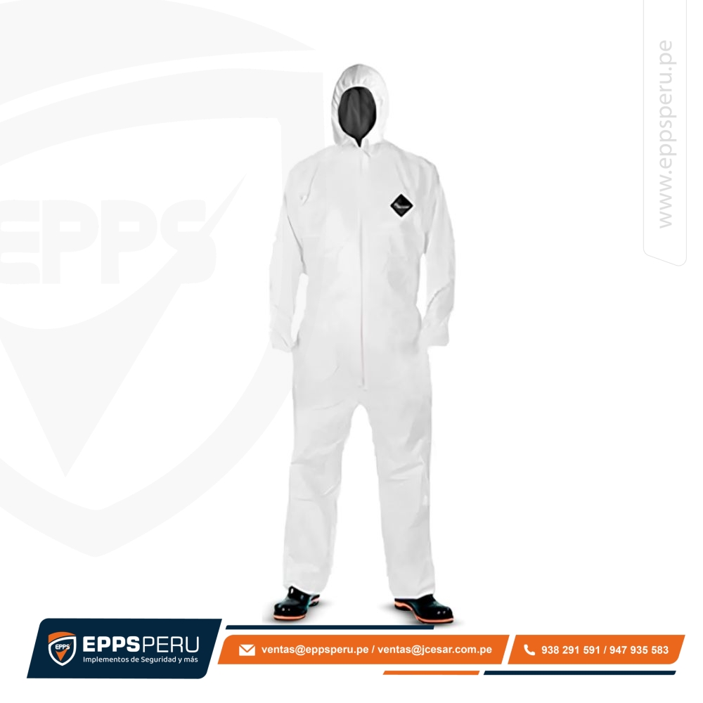 Traje contra partículas de uso limitado, a base de tela microporosa laminada de costura simple con capucha y elásticos en puño, capucha, cintura y tobillos.