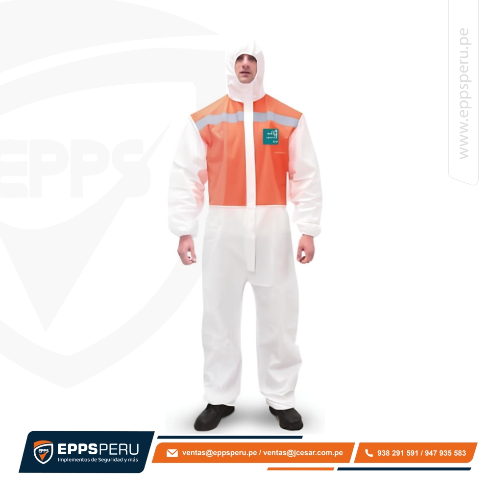 Traje contra partículas y salpicaduras, de uso limitado con costuras reforzadas, de tela laminada, y tela respirable en pecho y espalda. Capucha de tres piezas, cierre bidireccional, cintas reflectivas y elástico en tobillos, cintura, muñecas y capucha.